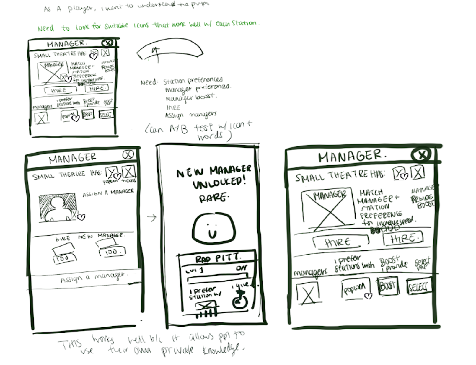 At the start of the game development, the team didn't have a designated UX Designer. However, when they realized the engagement with the managers's system (a component of the game) was not meeting the Key Performance Indicator (KPI), they reached out to me to help bring the engagement numbers up.