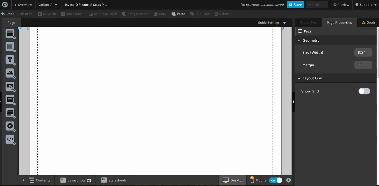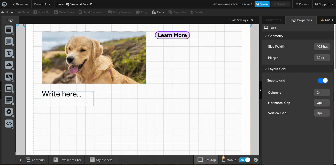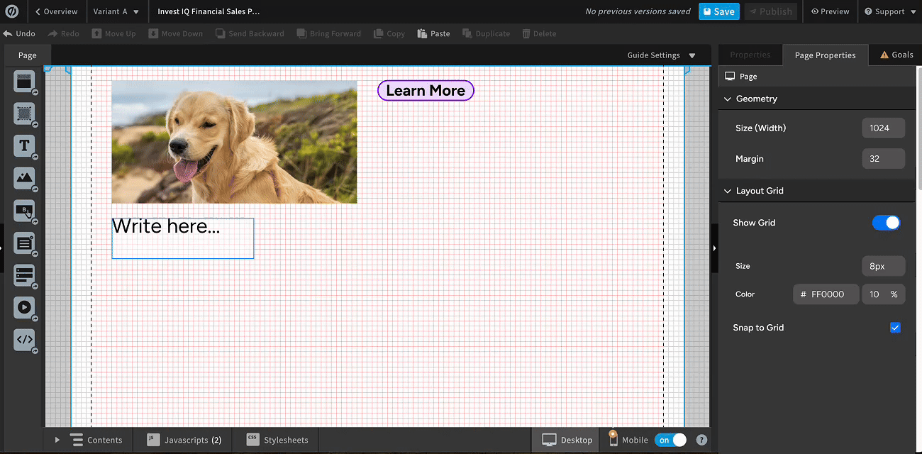 I added the ability for users to snap elements to the grid, so when they place elements onto the page, they automatically align to the nearest grid unit. If the user adjusts the grid settings, the page elements dynamically resize to stay consistent with the updated grid.